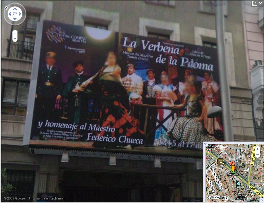 Google Street View, que es la tecnología de Google que muestran las calles de las ciudades a nivel fotográfico, como ya sabemos, distorsiona la cara de la gente para preservar su intimidad, pero por lo que se ve no solo lo hace con los viandantes, sino que carteles de cine, y logos son distorsionados.
